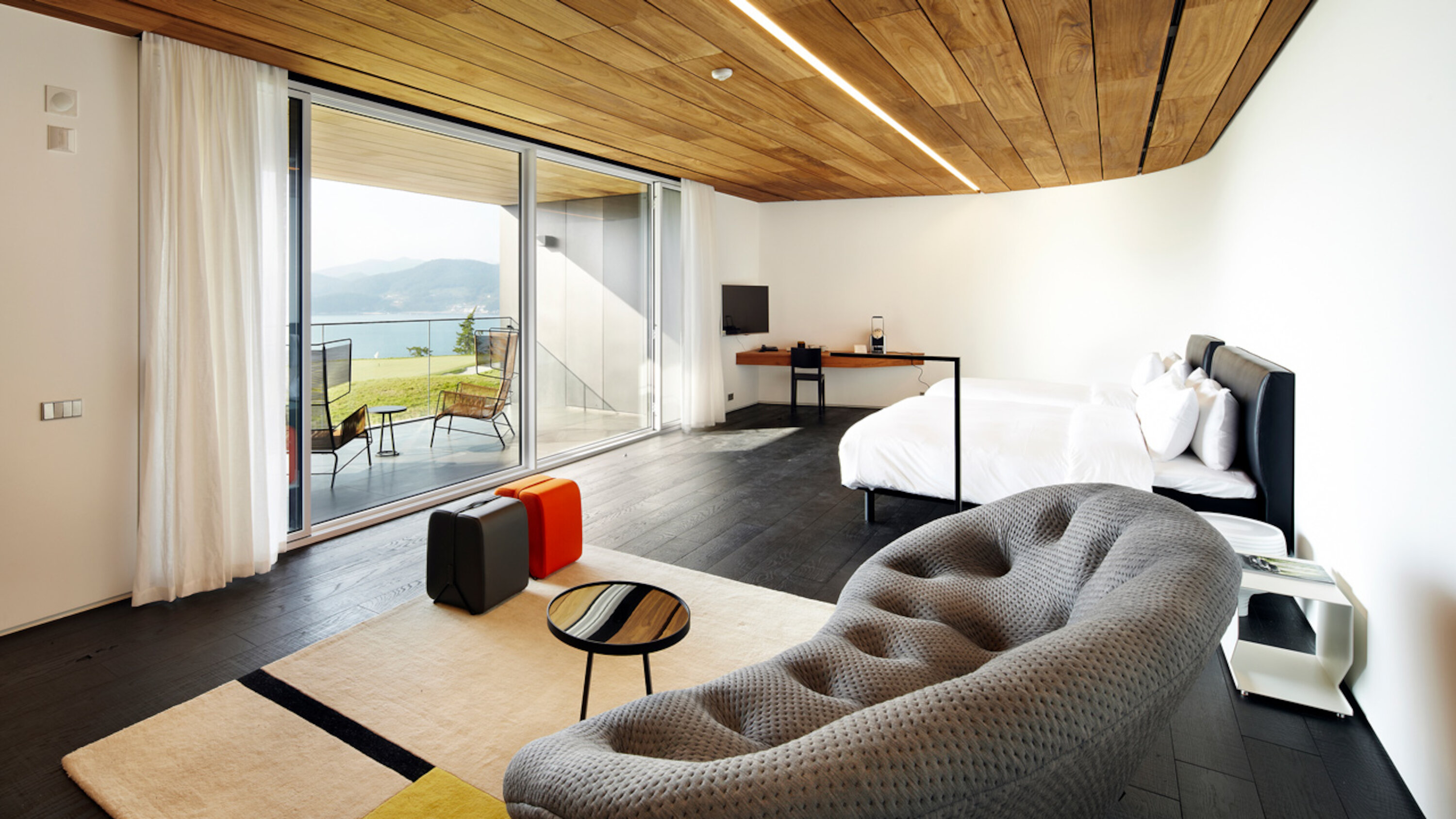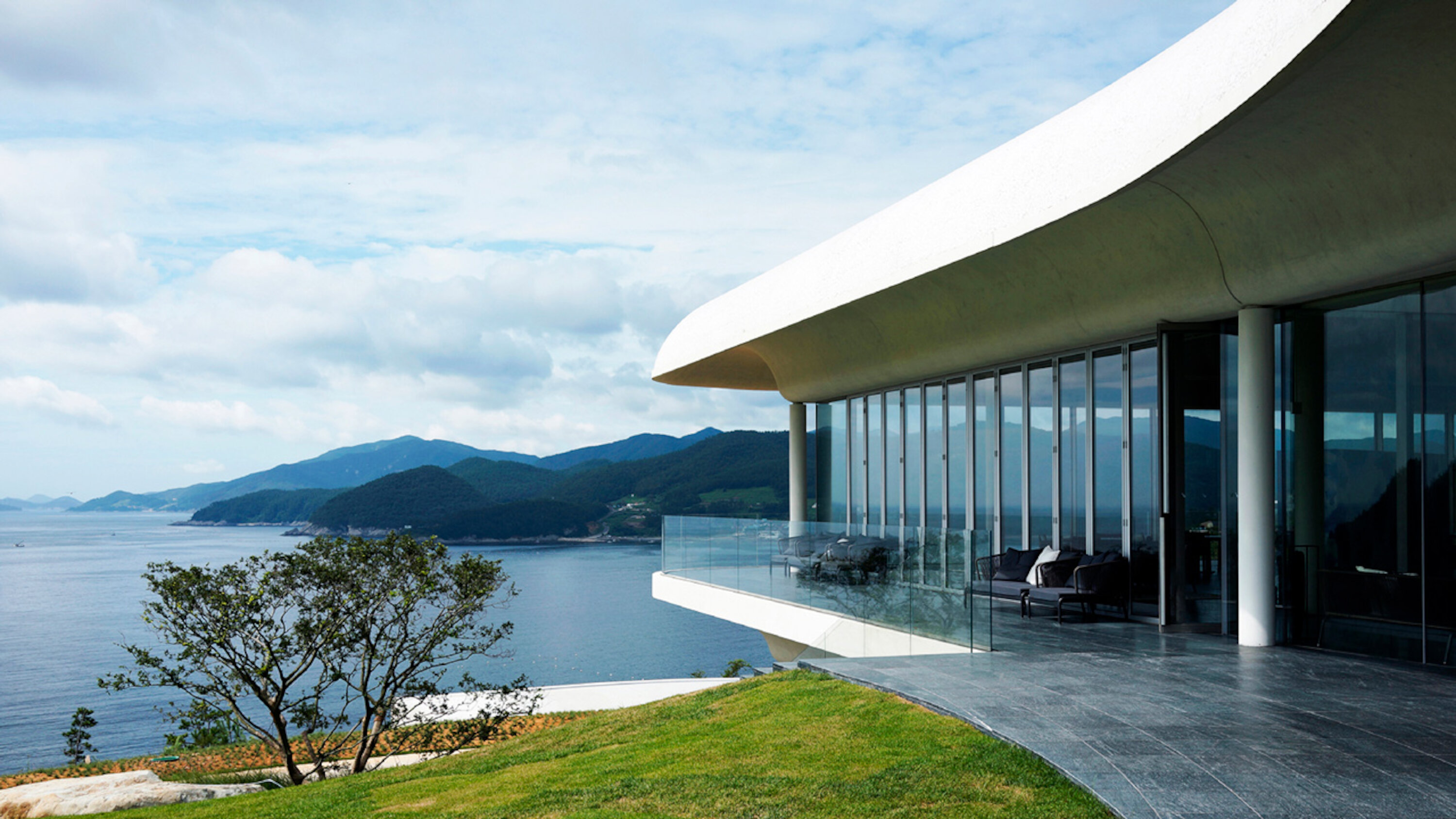 South Cape Spa and Suites is a resort complex facing the South Sea on the Korean Peninsula, where you can also enjoy playing golf. This luxury resort, which is open to the sea, offers guests the ultimate in relaxation. The concrete walls undulate like waves along the building, creating a dynamic appearance that makes it seem to float in the sky. Guest rooms are furnished with DUX beds and Ligne Roset furnishings, and you can enjoy a Geneva sound system. In addition, the rooms feature Aesop amenities. Don't miss the rare pianos and artwork scattered throughout the building.